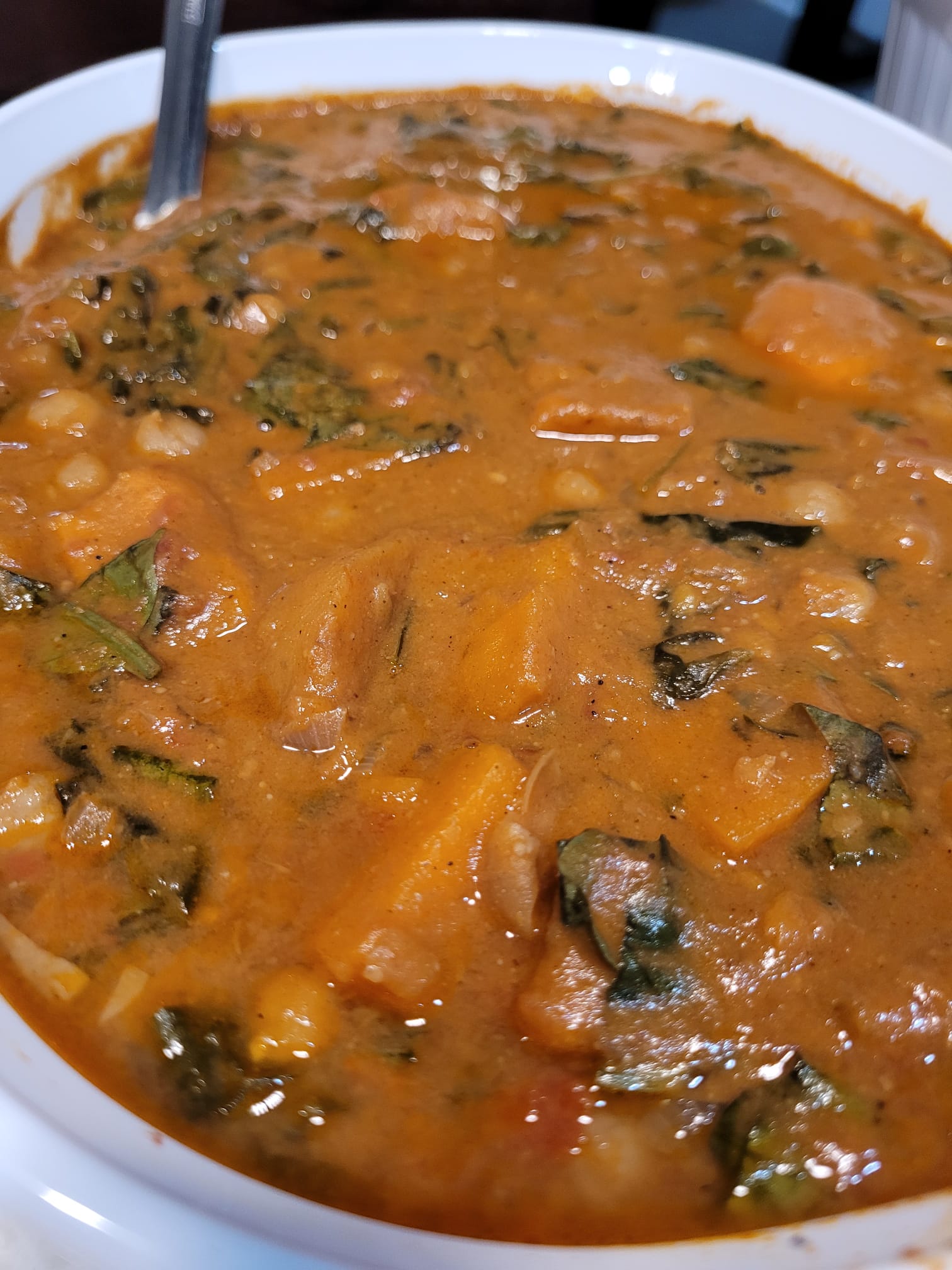 - Once the sauce has simmered for 15-20 minutes and the sweet potatoes are very soft, stir in the spinach and red pepper